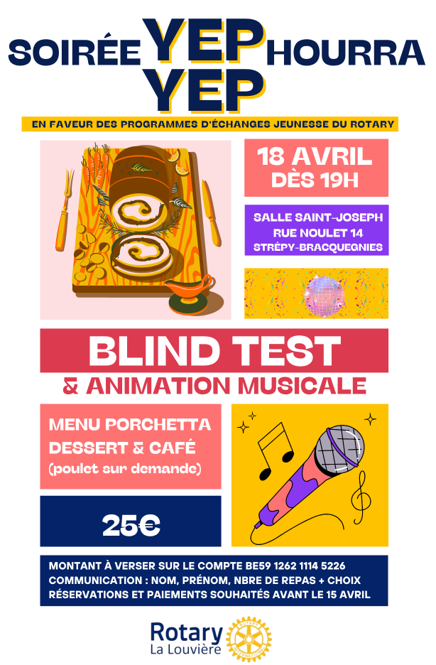 BE59 1262 1114 5226 en Communication : Concert + Nom et prénom Les bénéfices seront reversés aux œuvres caritatives du Rotary Club de La Louvière.