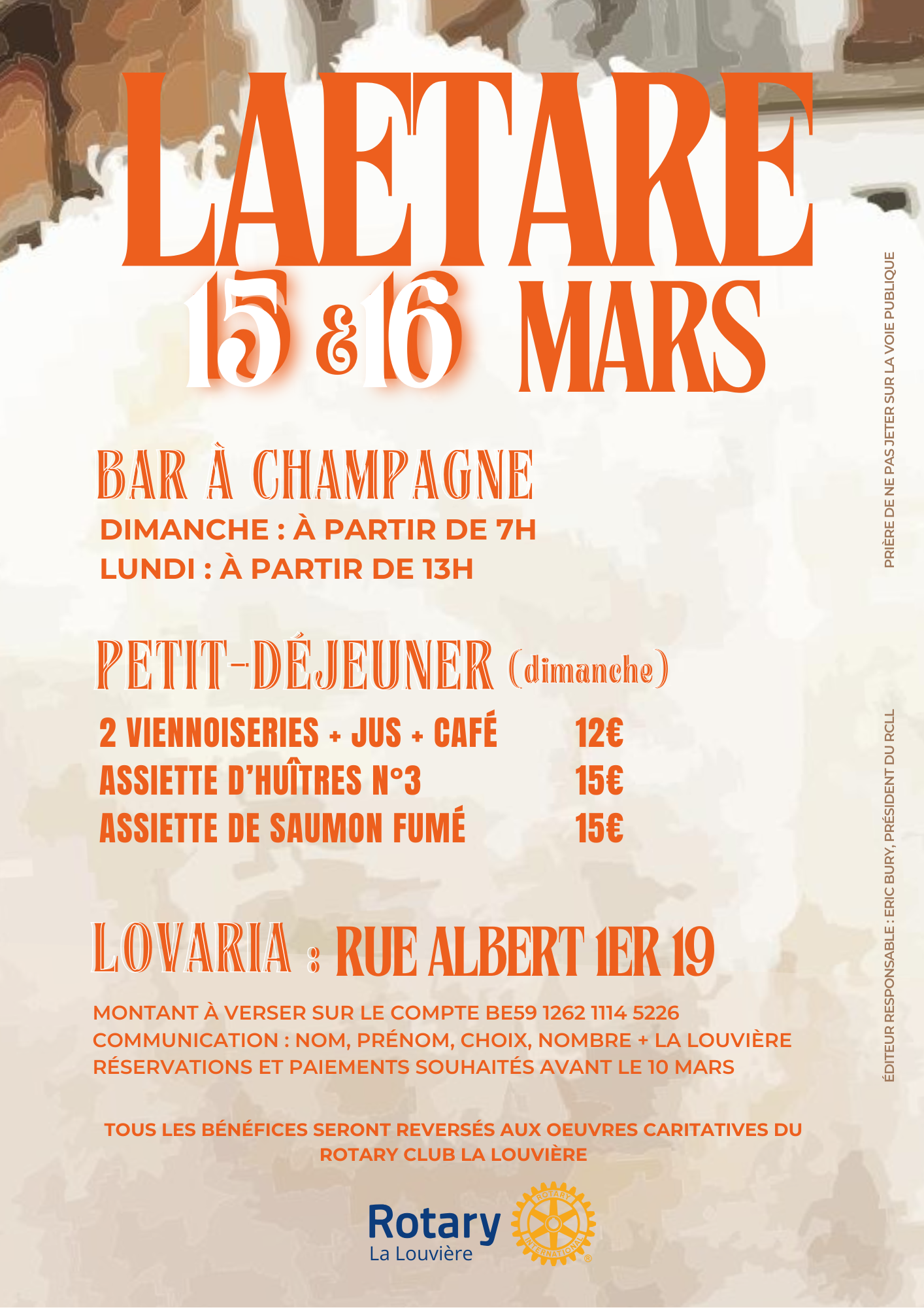 BE59 1262 1114 5226 en Communication : Concert + Nom et prénom Les bénéfices seront reversés aux œuvres caritatives du Rotary Club de La Louvière.